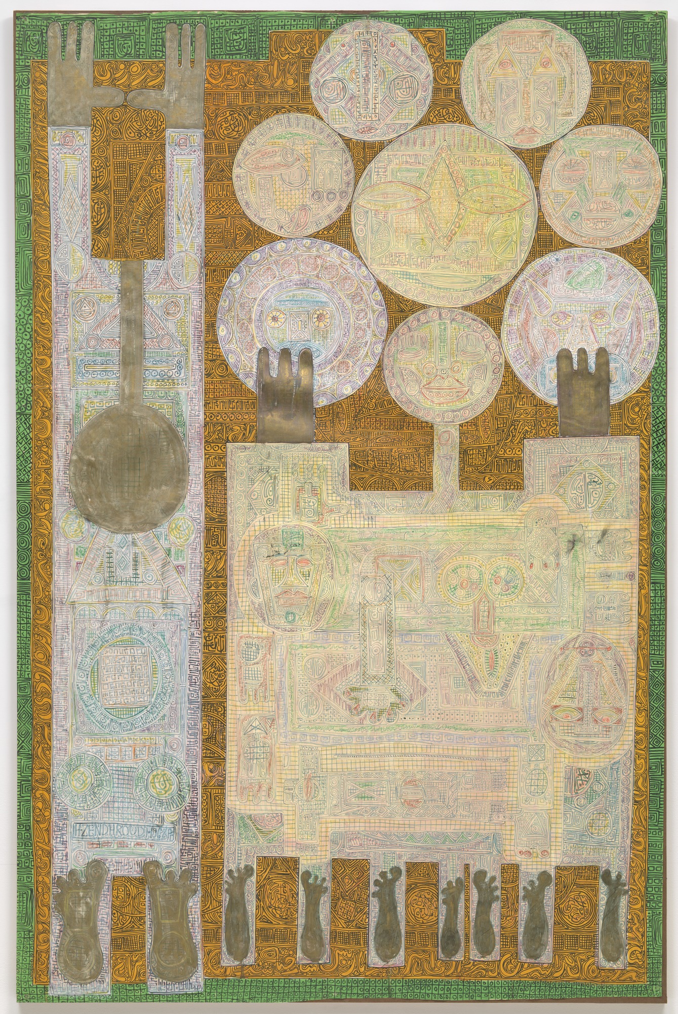 Fereshteh Daftari describes K+L+32+H+4. Mon père et moi (My Father and I) as "mechanomorphic in articulation and fashioned with a craftsmanship reminiscent of Islamic metalwork...astrology, religion, and personal history are enmeshed." Daftari adds, "the crammed surface leaves no room for Western ideology." The problem with this sexy and authoritative-sounding declaration is that "Western ideology," if there is one such thing, is not at all separable from the various divinatory and spiritual elements listed in Daftari's essay, least of all Islam, which introduced a vast number of scientific and mathematical discoveries to Europe. What would "the West" be without science and math? In other words, Islam, amulets, astrology, etc., are just as Western as Christianity--or Paganism.