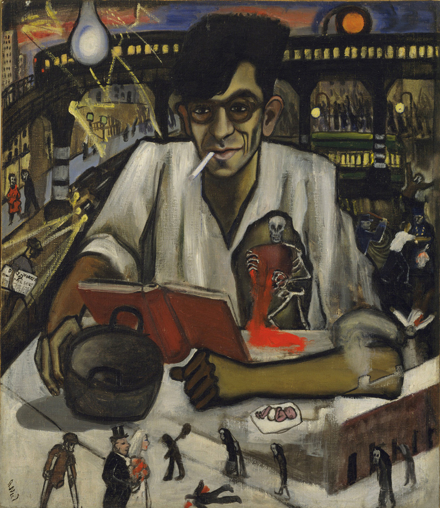 Instead, i this painting we see Fearing feeling comfortable in his natural habitat, posting up in a coffee shop, exuding all the qualities of New York artsy intellectual. The skeleton squeezing blood out of his heart is said to represent how deeply he felt for those suffering during the difficult times of the depression. Besides the baby (said to be his son) and the newlywed couple by Fearing’s arm, the rest of this painting is covered in images of anarchy. Police are beating civilians, disfigured soldiers roam about, and bleeding corpses are sprinkled throughout. This painting would appear to match the vibe of his poetry quite well. Why are the cute ones always so moody?