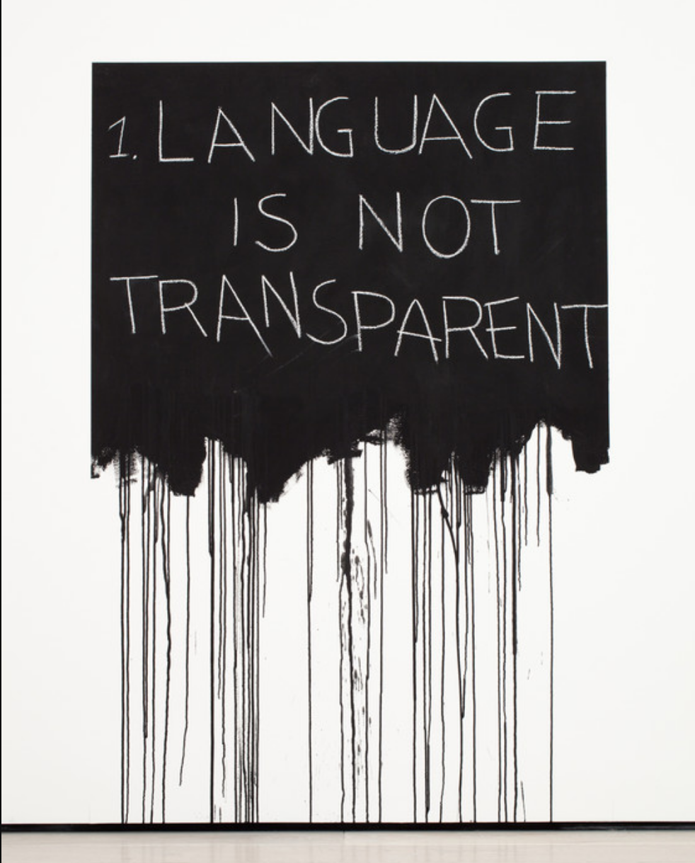 It may look like something on a junior high schooler’s bedroom wall, but Language is Not Transparent is actually a scathing critique of the danger of words as a medium.