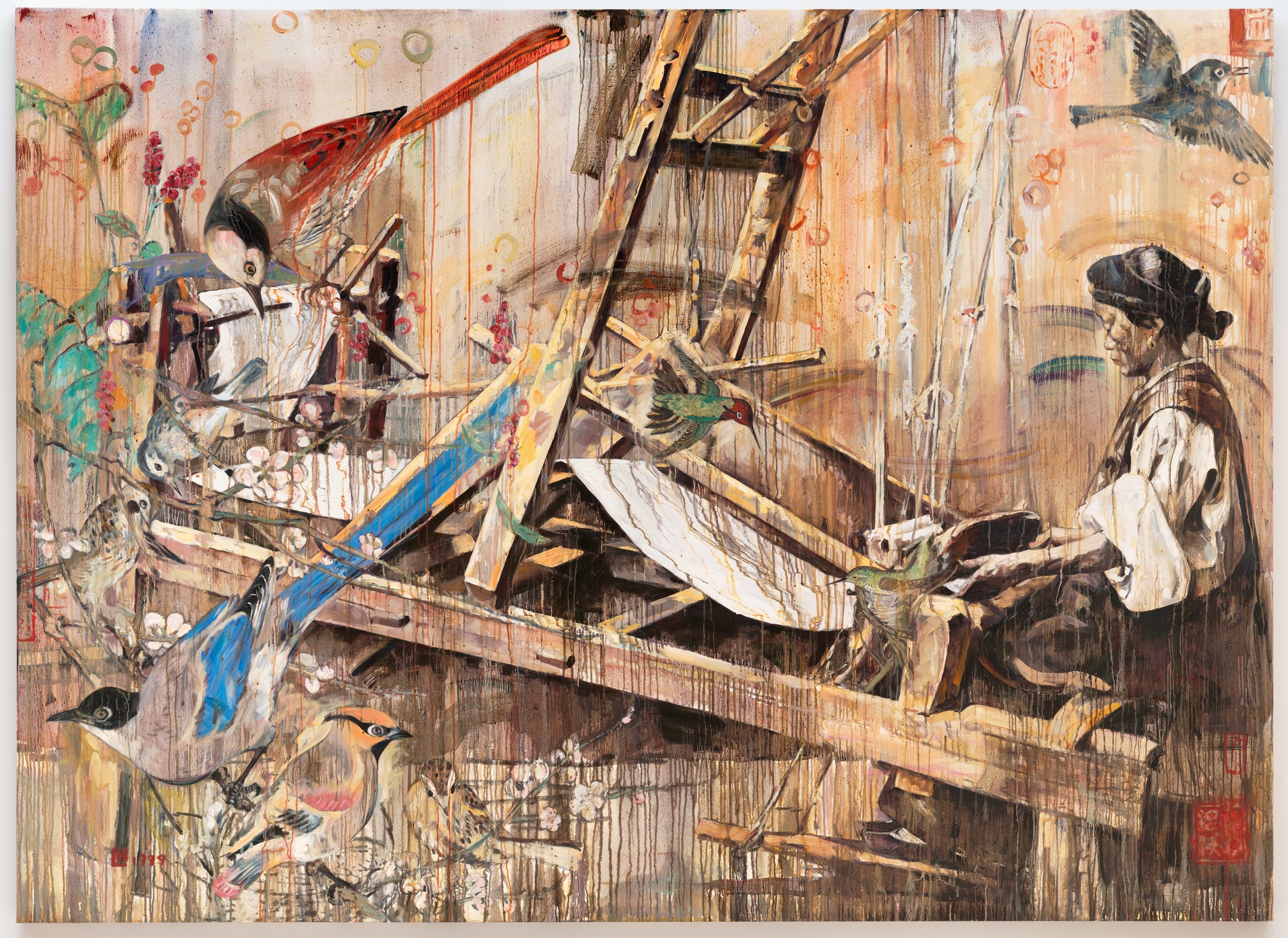 While planning the composition and colors to add, Liu thought about what might come to her mind while she was weaving. She also thought about the joy the woman’s work would bring to others. This led to the colorful array of beautiful birds filling the woman’s workspace, which are based on traditional Chinese painting - specifically Song Dynasty ‘bird and flower’ paintings. The photograph had been taken by John Thomson, a British commercial photographer. So she wove together inspirations from both the East and West, as she remarked in an interview, for this painting.