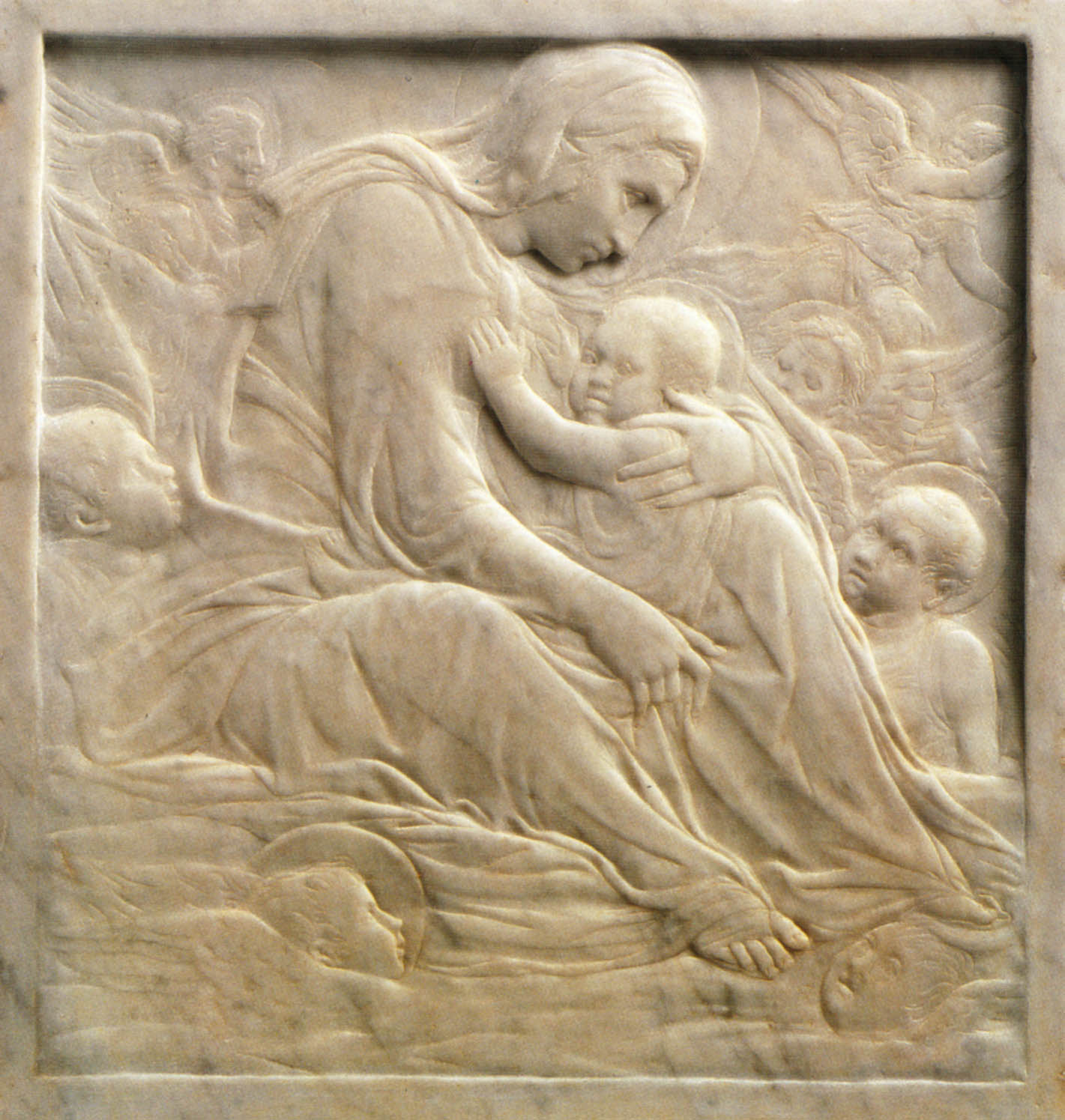 When Donatello set out on his own, his The Feast of Herod became one of the pieces that distinguished him from his peers (this work would eventually sit inside the Florence Baptistry). Then, years later, he would drastically innovate the relief medium with works like this. Madonna of the Clouds is unique because it is nearly flat. At the time most reliefs had a lot of depth with the artists cutting deep into the stone and essentially carving statues out of a wall. Here the depth is all illusory, and because of this restraint, he is able to do things like create the shadow halo that sits around Mary’s head. It's really like he is painting with the stone.