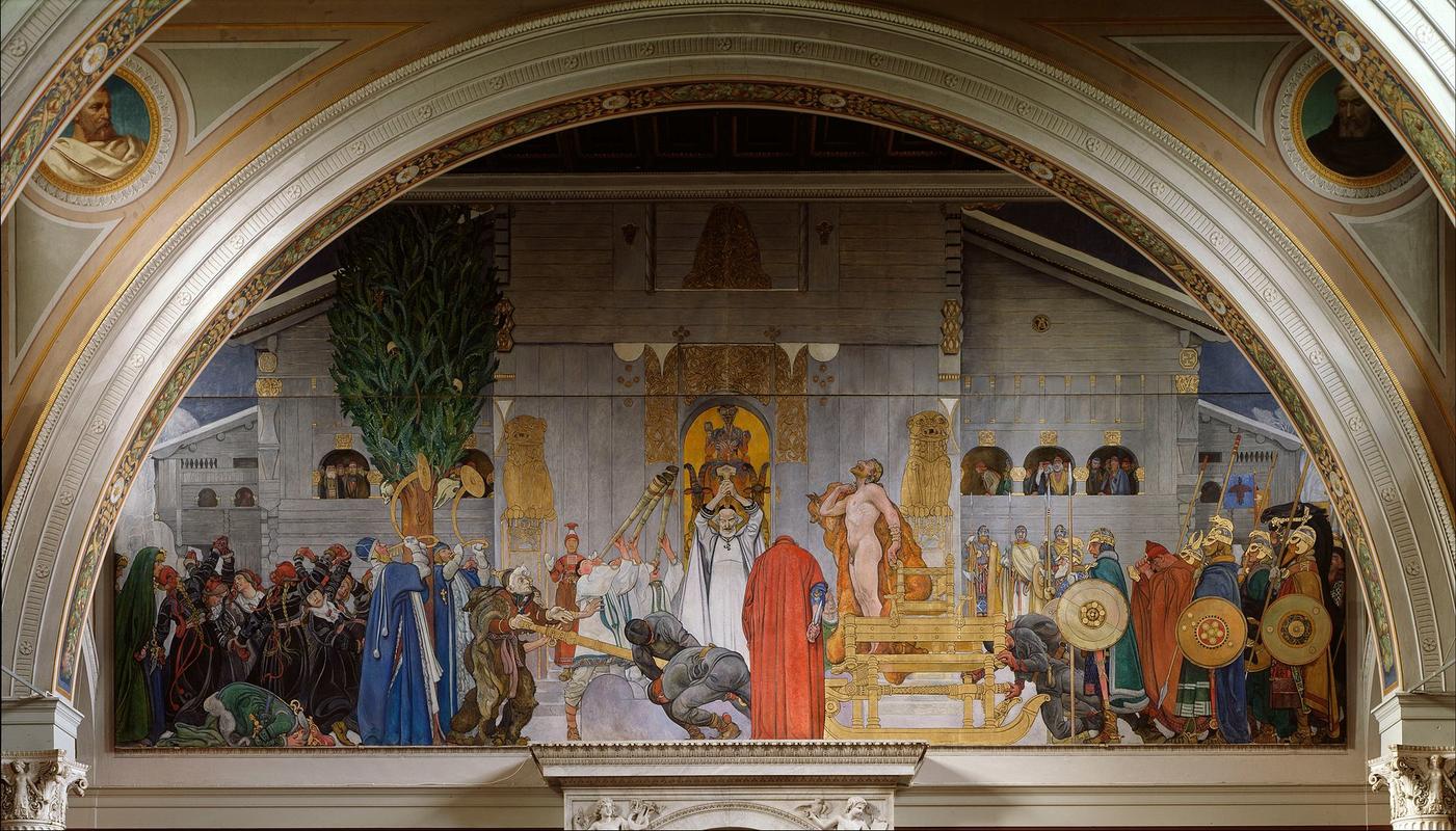 The painting depicts a legend from Norse mythology in which the Swedish king Domalde is sacrificed to avert famine. After long debate, the painting was rejected by the museum; but the controversy resurfaced in the late 20th century, and the painting finally was placed where Carl Larsson had intended.