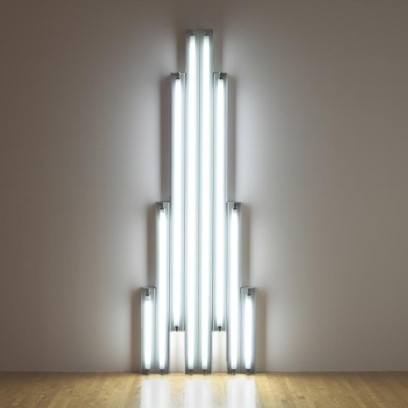 “Monument” for V. Tatlin references Vladimir Tatlin, the founder of constructivism, and his most famous work, Monument to the Third International, a design for a building that never came to fruition. He references Tatlin because he was “the first to free sculpture from representation and establish it as an autonomous form.” Flavin aimed to create an object that simultaneously separated itself from life and became an intrinsic part of it. His art consists solely of light, of fluorescent tubing that anyone could buy at Home Depot. As such, it emulates the most essential part of life. Perhaps the most intrinsic experience of life. Without the light of the sun and the light that we humans commercially produce, we could never exist. But Flavin’s works also detach themselves from the human experience by refusing to be representative art pieces. Unlike artworks that predate the pure abstraction that came about in the 20th Century, Flavin’s work declines to depict anything that we might find in nature, like a portrait, or a still life, or a landscape. Using only materials that anyone feasibly could buy and techniques that you don’t have to go to art school to learn, Flavin upheaved the art world’s definition of what can and cannot be considered art.