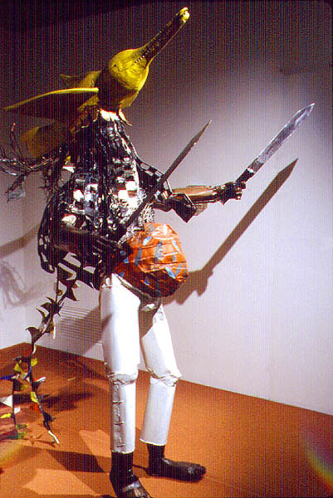 The Kalabari live on 23 islands in the Delta and are particularly aqua-sensitive. To make sure they are on good terms with the enormous amount of water around them, young Kalabari men dress up as merman hermaphrodites with wickedly eccentric headgear. Naked Big Fish, for example, has a canary-yellow and winged dolphin-crocodile. Camp has also put him in a sexy vest because, as she explains, "I like men in string vests. I love that their nipples can be caught in the string." Aha.