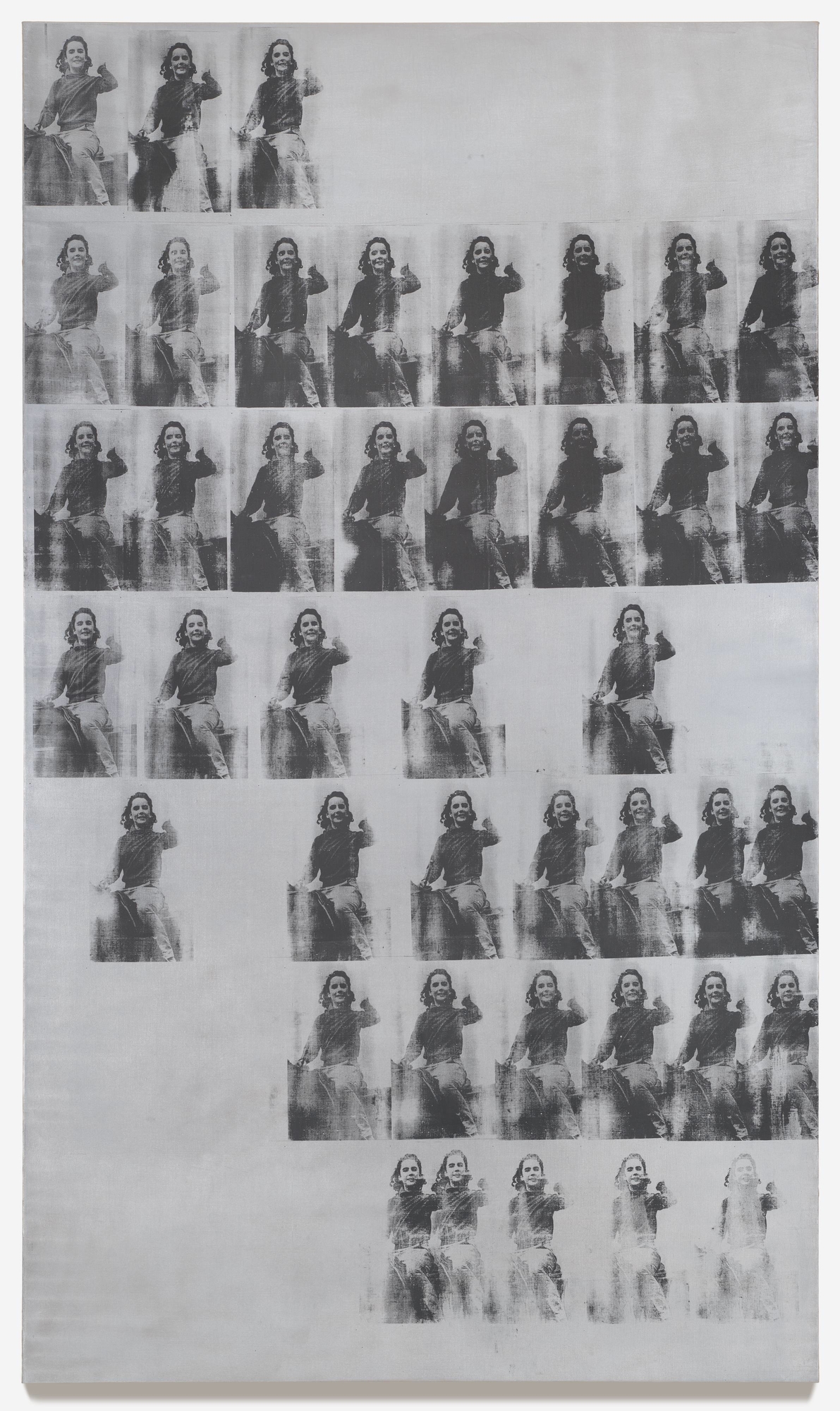 It is comprised of multiple adolescent Elizabeth Taylors on horseback, based on a Life magazine photograph of Taylor on the set of the film with the same name.  In his Death and Disaster series, Warhol often used tragic starlets and socialites as subject matter, including Taylor along with Marilyn Monroe and Jackie Kennedy. At the time Warhol was working on the painting, Taylor was rumored to be dying from cancer in London. He was fascinated with Taylor’s celebrity, especially her many brushes with death, and created over fifty works with Taylor as the subject in his lifetime.
