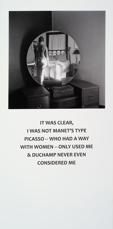 This work depicts a self portrait of the lady herself half dressed or nude with captions such as “It was clear, I was not Manet’s type… Picasso—who had a way with women only used me & Duchamp never even considered me" and “But it could have been worse imagine me fate had de Kooning gotten hold of me.” By pointing fingers at heavy hitters like Manet, Picasso, Duchamp and de Kooning, Weems covers her bases of artistic movements - Impressionism, Cubism, Dadaism, and Modernism - that have blatantly ignored or abused the image of Black women and women in general. de Kooning at one point even claimed to be “cunt-crazy” so you can imagine the kind of hands the fate of the representation of women was in... But now finally Black women are getting a chance to represent themselves, which shouldn’t be ground-breaking, but nonetheless is ground-breaking.