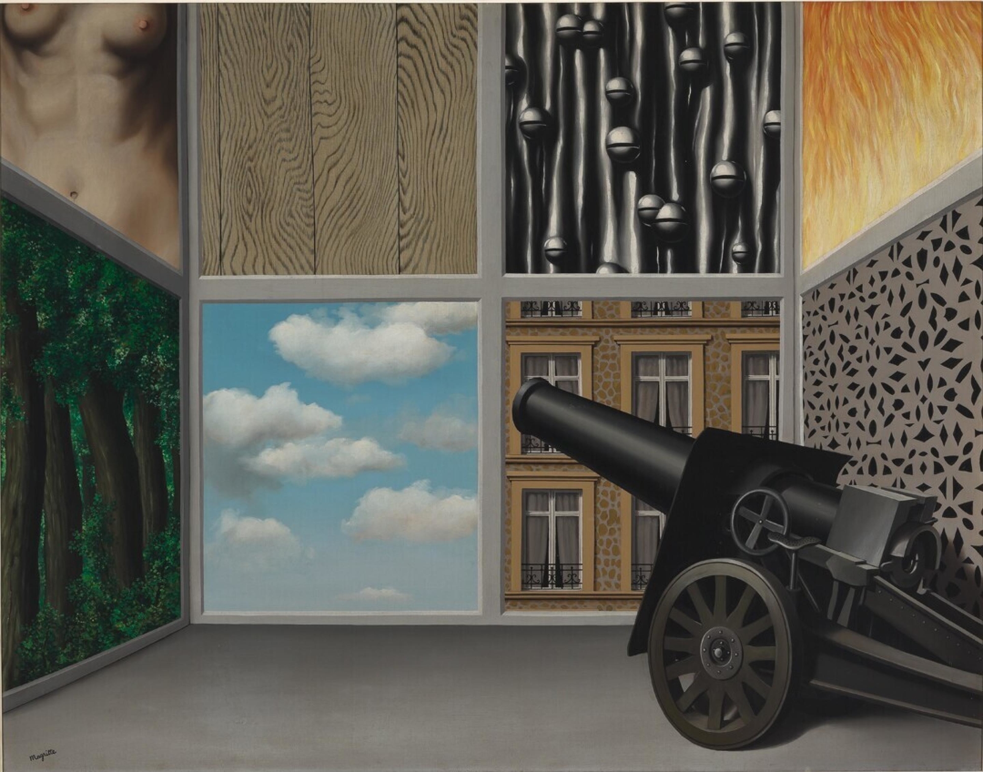 It is important to recognize that this is one of many Magrittes which represents violence toward women, particularly the female torso, as noted by the writer Lisa Lipinski, which is both straight from the unconscious and quite difficult to accept. Magritte was overcome with shame, in constant contact with his wife who had caught him in an affair the year earlier. Magritte also had unresolved childhood trauma regarding his mother. As Lipinski reminds us, Magritte would have not have wanted writers to psychoanalyze him and read his paintings symbolically, as the strangeness of the work should speak for itself...but the cannon at the woman's torso is not a good look, which was probably the whole point. One of the main goals of the Surrealist clique is to regurgitate the symbols and horrors of war, a bit like Francisco Goya, in order to wake people up. Does it work?