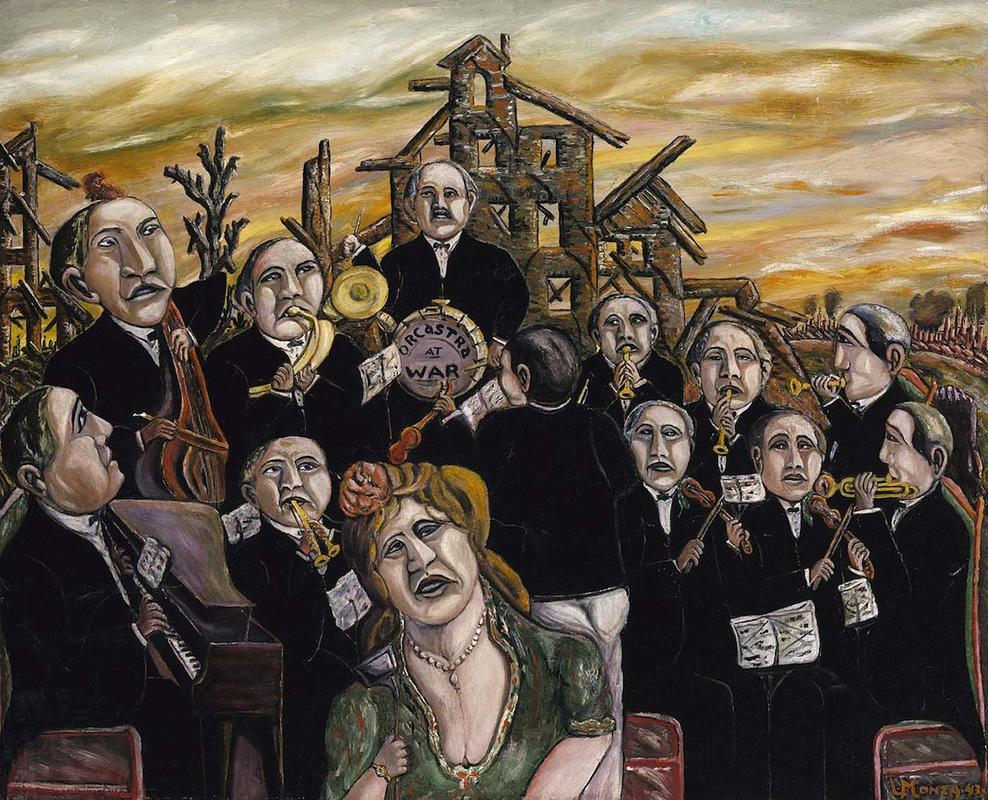 Louis Monza's use of color, shape, and lines really catch my eye. The way that he uses the lines to show some of the abnormal shapes of some of the human anatomy, then using darker shades to emphasize it. The brighter used to create a sunset background really make the darker colors of the clothing he painted pop.
