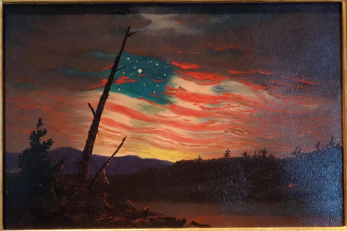 This painting is a bit of a departure from Church’s usual grand, romantic landscapes. It’s a small allegorical piece featuring a red, white, and blue flag created out of the colors and clouds of the rising sun against a hilly landscape. The flagpole is a crooked tree trunk in the foreground, and the 33 stars of the Fort Sumter flag are represented by the stars of the retreating night sky peeking through the clouds. Amongst these stars is a vivid North Star, representing, no surprise, the North. Here, the North Star and rising sun presents the Union as a guiding, heavenly light. If all of that wasn’t patriotic enough, there is even a silhouette of a bird, likely an eagle, visible in the darkness above this enduring Union flag.