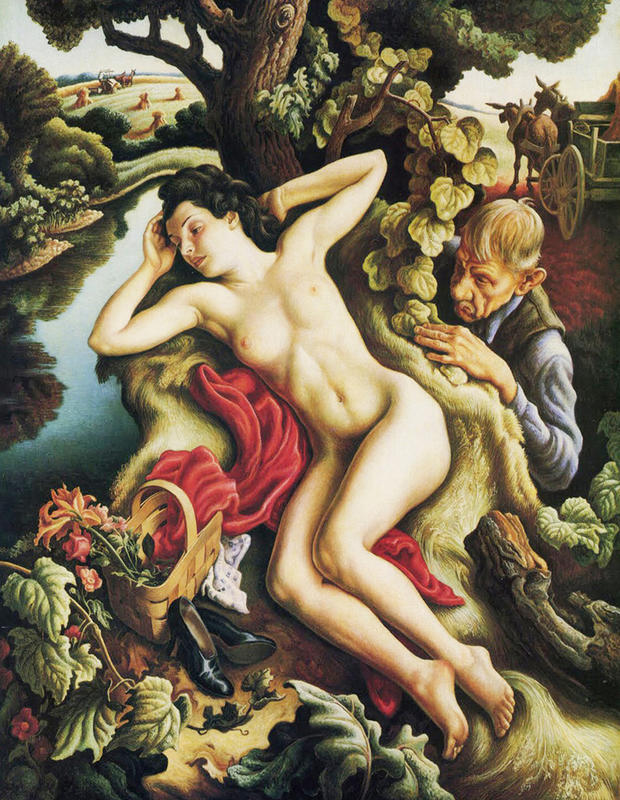 In 1935, Benton left his teaching post at New York’s Art Students League for his home-state of Missouri. Officially the reason for the move was opportunity, he’d earned a mural commission for the Missouri State Capitol in Jefferson City and was offered a position as head of the painting department for the Kansas City Art Institute. In actuality, he was no longer welcome in New York after making numerous homophobic remarks about curators, generally refusing to conform to the leftist politics of the community, and having a style that had been outmoded by modernism. What do you do when the hub of the American art world tells you that your style and social opinions are too old fashioned and folksy? Obviously you incorporate more tired mythological and pastoral tropes into your paintings while asserting your masculinity through the display of a hot young woman fully nude being subjected to a pervy old man.