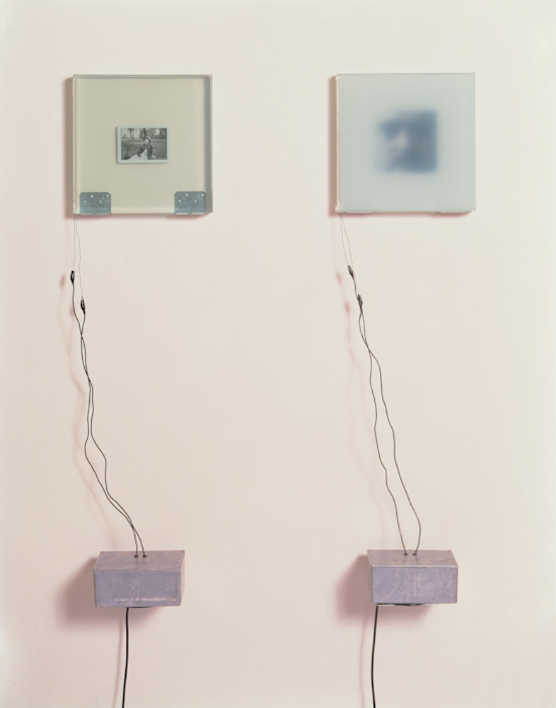 Created after his mother had been in the hospital battling pneumonia, this work consists of a photograph of the artist’s mother encased in glass and wired to a metal box labeled, “My breath January 1996 1 hour.” In what is both a sad reminder of his mother’s difficulty breathing and a physical manifestation of memory the glass fogs up in correlation to the recorded sound of Campbell’s breathing.