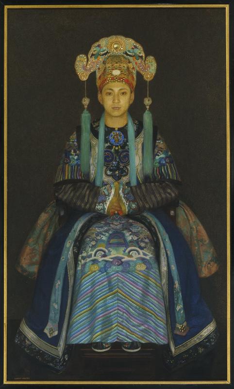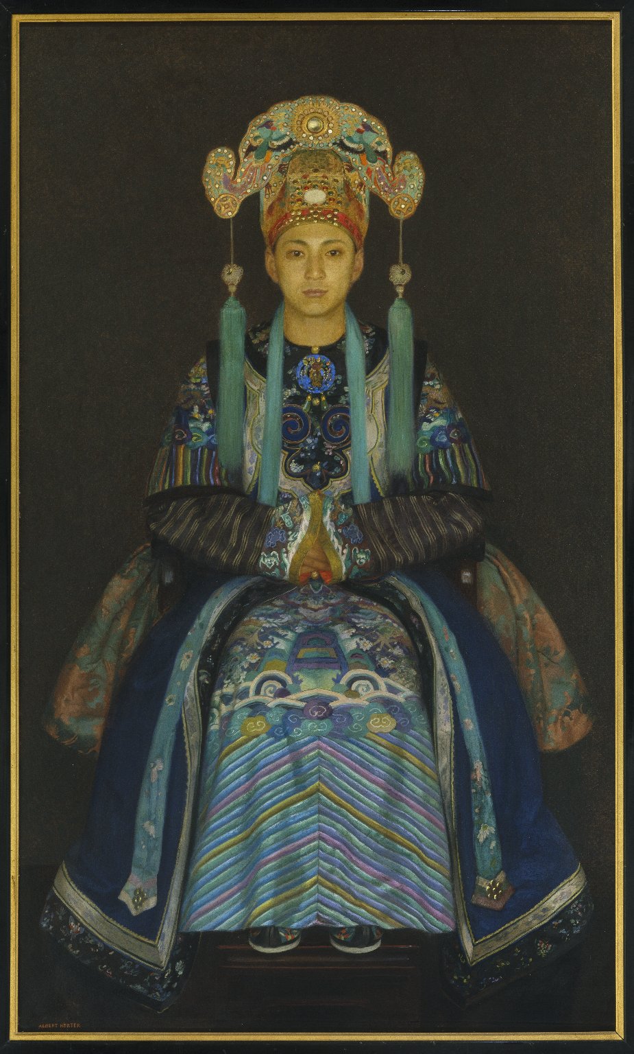 This is at least the second Herter painting of the folklore character Aladdin, following one which he displayed at New York's Kit Kat Club decades earlier. The name of the Korean actor hired by Herter to pose as Aladdin and pictured here in Qing dynasty threads, has unfortunately been lost in translation several times over. As early as 1924 the Pennsylvania Academy of the Fine Arts mistakenly gave the name of the actor in this portrait as "Pilgrim Yoon" in a catalogue, and other publishers repeated this error until as late as 1989. Embarrassingly, as of May 2020, the Smithsonian Institution still calls this man "Pilgrim Yoon" on its website, and dates the work as from 1824. Herter, of course, was not born until 1871. Your tax dollars hard at work, folks.