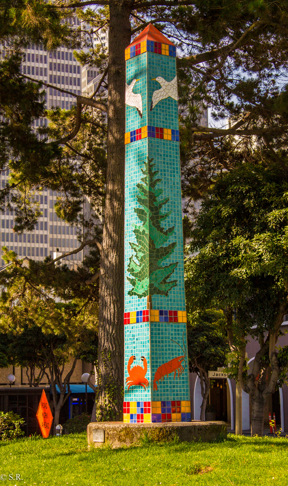 The obelisk in question depicts a mosaic of a green pine tree, two red lobsters, two red crabs, and five white birds. Very idyllic and absolutely perfect for its location near the San Francisco Ferry Building along the marina.