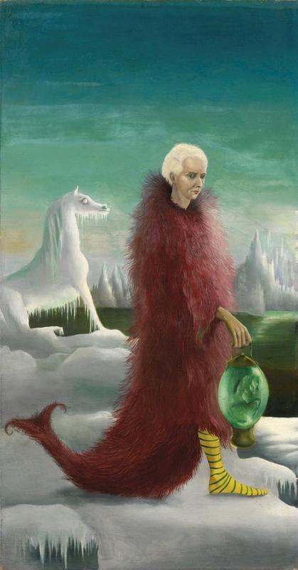 We see both avatars in this painting, with two horses including a giant icy one, seated like a dog, springing from the ice in the background, and the small one in the lantern that Ernst is holding. Ernst is also in a fabulous feathery mermaid coat, both a reference to his alter ego Loplop and a mermaid sculpture at the home they shared in France. Most reports of their relationship show that in 1939 the couple was still happy, perhaps best evidenced in the desperate letters she sent to her friends when Max was interned at a camp for German citizens.