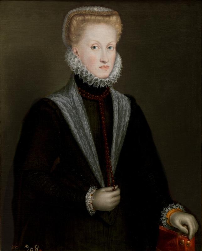 Around the time of their wedding, Anne decided she’d get rid of the memory of one of Phillip’s other squeezes. Phillip had a portrait, one that he actually is said to have liked a lot, that was also painted by Anguissola. In 1573, Anne commissioned Anguissola once again, just as she was on her way to retirement, to paint a portrait of the new queen in the fanciest stiff, starched, dark fashion of the Spanish court. She then told Anguissola to paint over her husband’s old portrait to cover up all of his fancy, flashy garb from an earlier era and make his portrait just as stiff, starched, and dark as hers.
