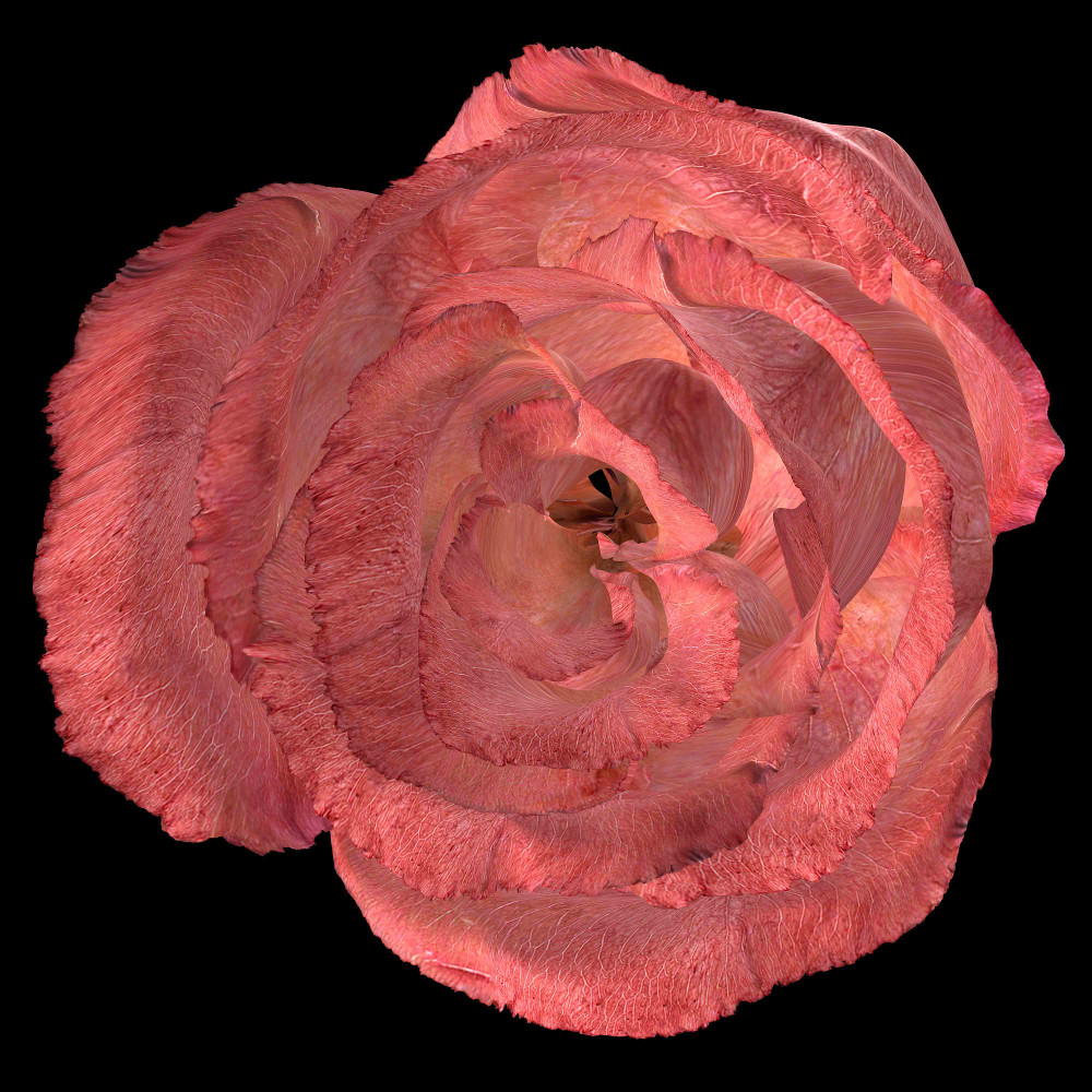 The video shows us a 3-D animated rose as it gently flutters open and closed, accompanied by a really deep breathing soundtrack. The rose inhales and exhales along with the audio like an isolated bodily organ. The veiny pink petals look fleshy, and their movements look like internal functions of the body.