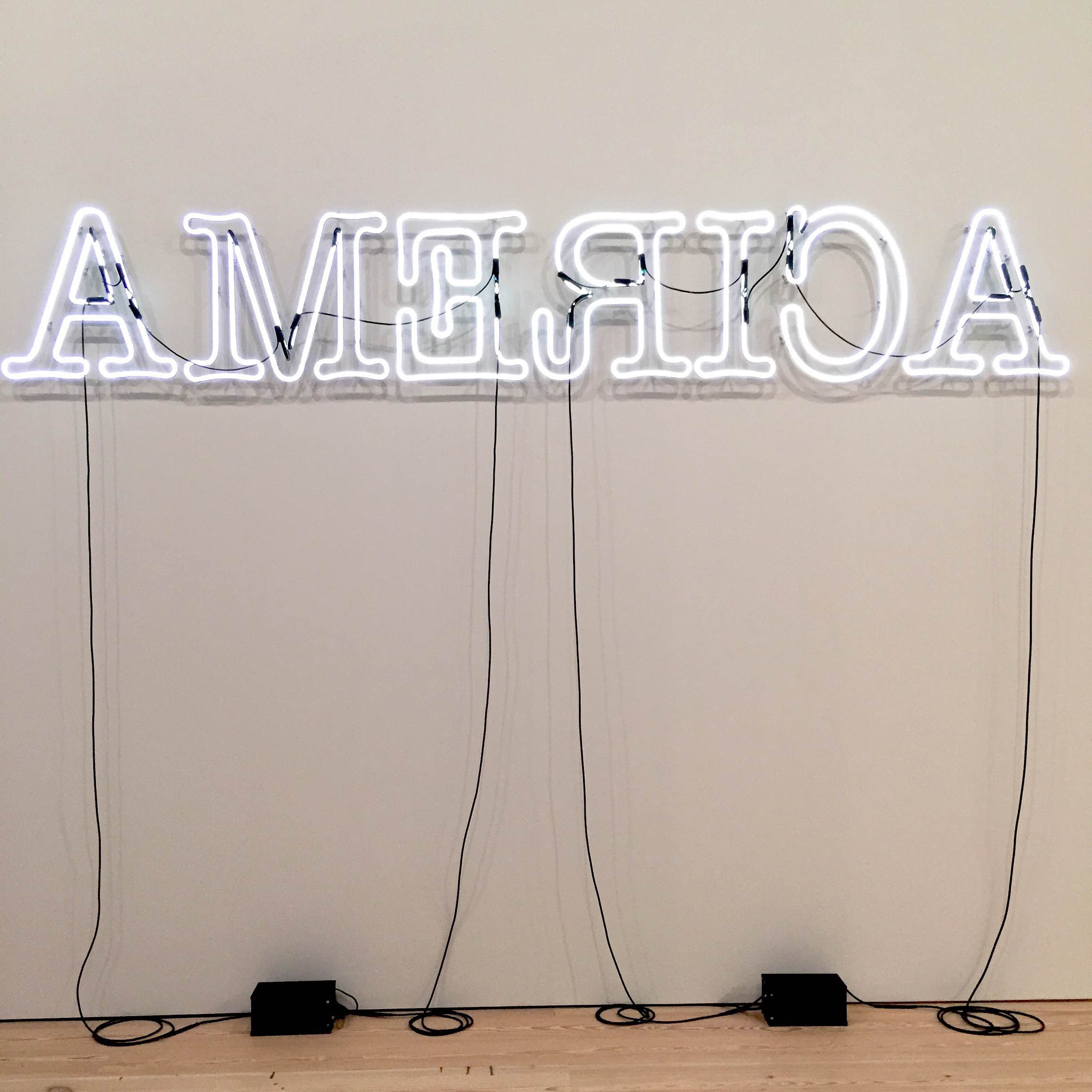 Ligon said he thought it was interesting that even when viewed backward, the word “America” still looks like “America.” He stated, “I realized that if you turn the letters around, it makes a very strange word. It's still the word 'America.’ The word faces you and turns away from you at the same time." Metaphorically and literally, though, some things are clearly different. Ligon’s experiences show up on the neon tubing as black paint marks, while the flipped but appropriately ordered letters help nudge viewers towards its main message.