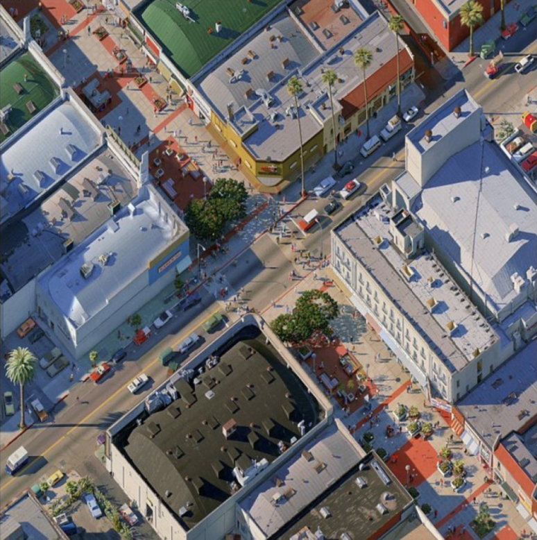 Doolin’s got the bird’s-eye view of the Third Street Promenade in Santa Monica, an outside mall of sorts by the beach in Southern California. It took him years of studying the area, doing baffling mathematical calculations on perspective and even taking helicopter rides to complete this stunningly accurate image. He climbed up on the roof of every business that would let him and took pictures from every angle, hopefully not being mistaken for a perverted peeping tom in the process. (I would be pretty freaked if I saw a camera lens through a dressing room window!)