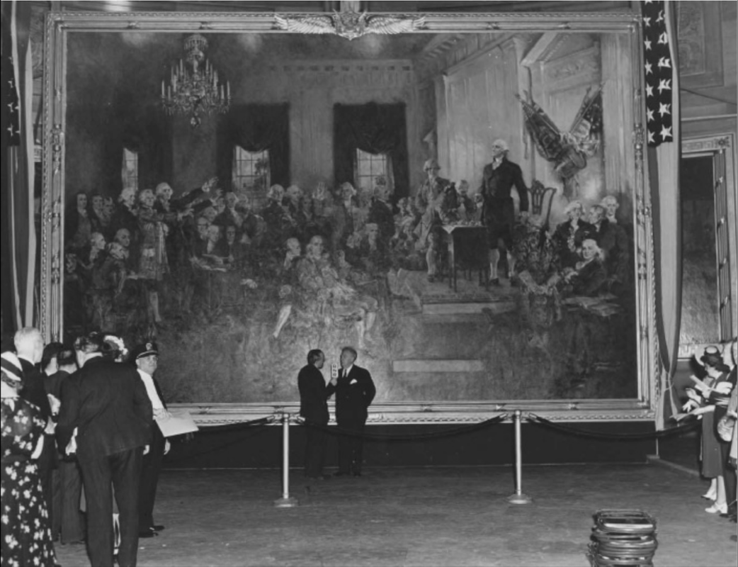 Further, when the commission for The Scene at the Signing of the Constitution of the United States was first considered in 1937, it stood on the heels of the largest depression in human history and at the beginning of its largest war. Though America would not play any formal role in WWII until 1941, U.S. politicians watched the chaos in Europe unfold. Poland had been invaded by the Nazis in 1939 and the rest of the continent, crippled by the Great Depression, was doomed to fall without intervention. U.S. lawmakers felt it necessary for the public to have a clear, fact-based monument to honor American democracy instead of a symbolic gesture towards freedom to fight fascism.