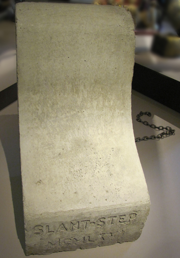 According to the legend of the Slant Step, William T. Wiley rescued the slant step (not pictured here) from a Marin thrift store in 1965, for a mere fifty cents. At the time, he considered it a novelty. Made of wood coated in linoleum, oddly shaped, sort of ugly, and not clearly useful, the Slant Step might almost have been a chair or a footrest (but not quite).