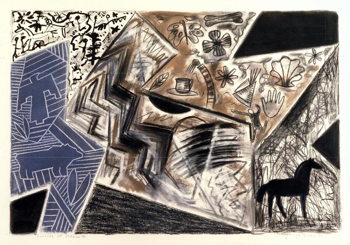 Jaune Quick-to-See Smith's pastel-and-ink Sources of Strength uses symbolism to express the artist's vision of native people's power.