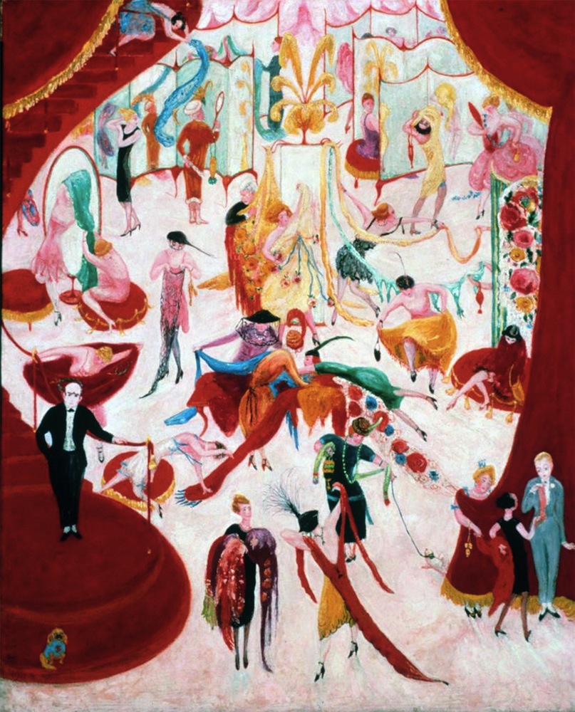 In this painting, Stettheimer gives us a glimpse of the chaotic world of avant-garde shopping in New York. You get a sense she’s judging the women desperately clawing at the designer duds. Seems Stettheimer was a bit jaded with the antics of the super wealthy. Is all they do shop? Even the adorable little pooch in the bottom left corner cares about labels. He’s rocking a monogramed sweater with Stettheimer’s initial on it.