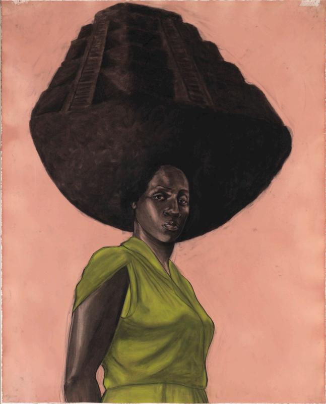 Pruitt has created a trademark out-of-this-world hairstyle in Steeped. This hairstyle is a common sight in his work. Steeped shows the allusion to escape as the sitter’s towering hair has two staircases leading up. It seems like a solid structure I could run up and not break; the subject’s hair is like an Aztec pyramid. In this future Pruitt created, afros could very well resemble architectural structures. Steeped isn’t the only time Pruitt has shaped hair into structures. Previously, he’s shaped hair into Nubian pyramids, melding together different sources of inspiration to portray individuals. It’s his way of attempting to break the limitations of people in the future and forget about the constraints society pushed onto us.