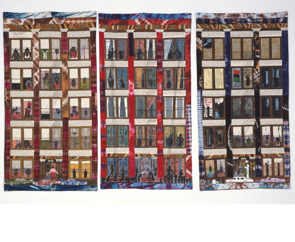 This work is a triptych consisting of three canvases sewed onto quilts. The painting is a narrative piece, for which Ringgold tells a story of the lives of people in an apartment building in Harlem.