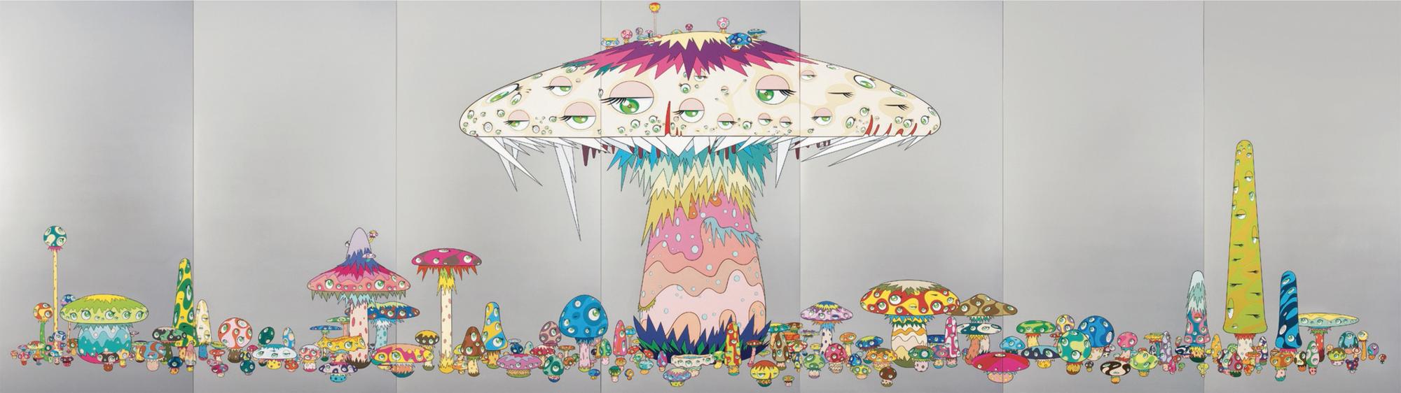 This sizable seven-panel painting highlights Murakami’s quintessential aesthetic in which he revamps objects from the mundane everyday and stylizes them with a kitsch cuteness that's revered in Japanese culture today. Greatly influenced by manga and anime, Murakami translates their flat, 2-D imagery to create his out out-there style. This aesthetic, which he coined as “Superflat”, attempts to show no brushstrokes or sense of perspective and depth. Fortunately for Murakami, the painstaking patience that is required to achieve such flatness is unbeknownst to him, due to the fact that he never touches his art but rather hires technicians to create his paintings for him. Cushy.