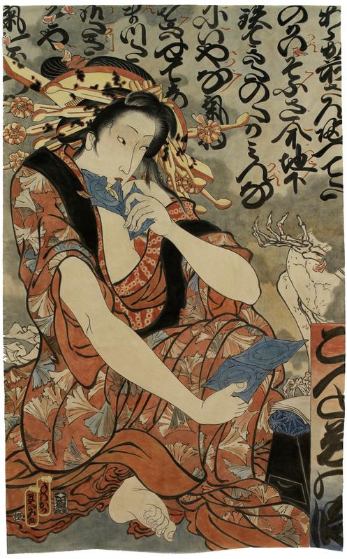 Tale of 1000 Condoms/Geisha and Skeleton is one of three pieces Teraoka created in 1989 as part of his Tale of 1000 Condoms series. The Tale of 1000 Condoms series reflects the public’s fear of contracting AIDS and drills into the viewers’ heads the importance of effective contraception in preventing transmission. Tale of 1000 Condoms/Geisha and Skeleton shows a geisha tearing open a XL condom as she gets ready for her next client. Geisha are Japanese female entertainers who sing, dance, converse, perform tea ceremonies, and play music to captivate wealthy male clientele. Although their primary duties are considered high art, many geisha are known to dabble in prostitution to capitalize on their customers’ desires and deep pockets.
