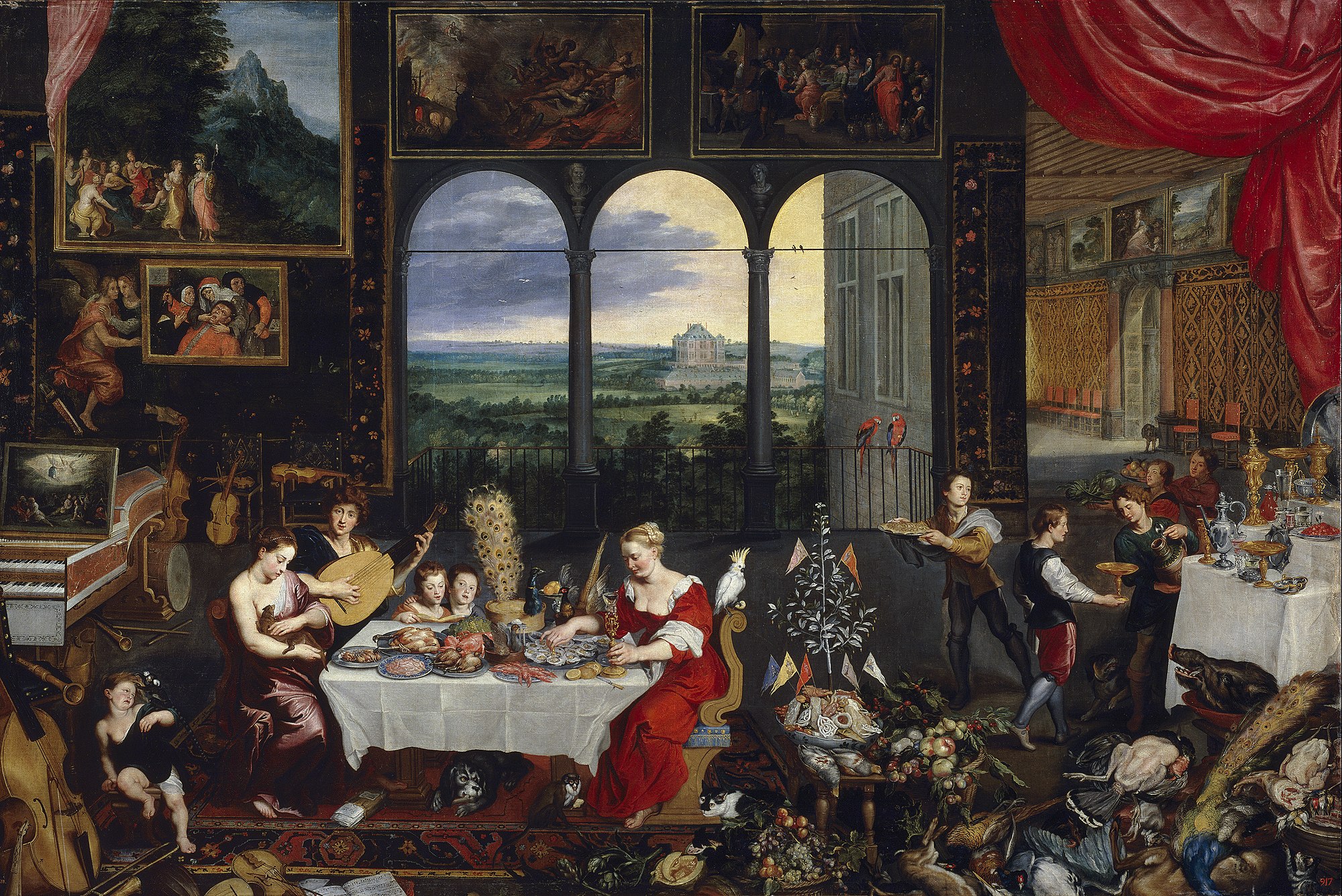 The allegory of The Senses of Hearing, Touch and Taste emerged during a time of great instability due to hygiene and public health issues in Europe, and there was a major debate as to how the senses related to health and disease. Less than a decade after the Antwerp city magistrates commissioned this painting, cholera claimed the lives of Jan Brueghel the Elder, three of his children, and the Archduke Albert.