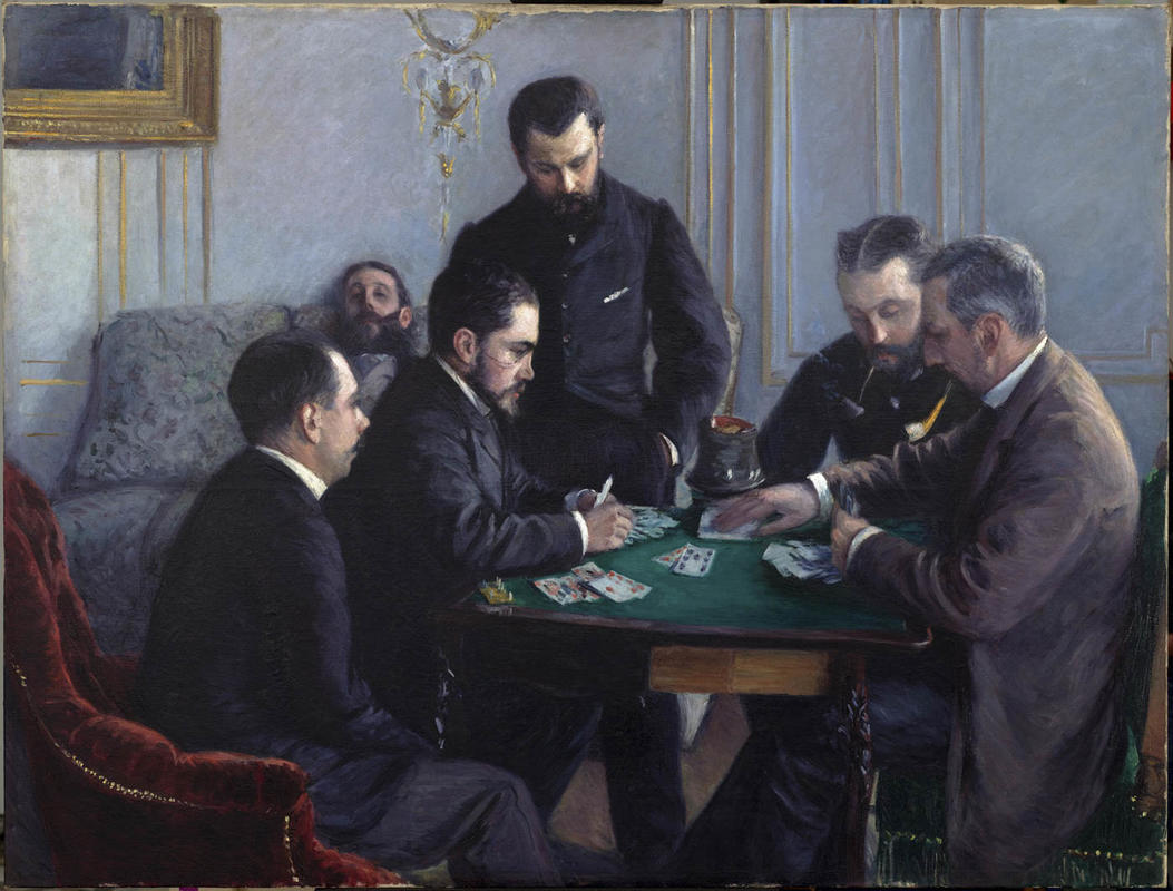 Ahh, a moment of homosocial bliss in an otherwise unruly group of friends. This scene of upper-middle class men is more realistic than the work of Caillebotte’s impressionist friends, some of whom are probably portrayed in this painting. Caillebotte painted The Bezique Game in 1881 when he was involved with organizing various exhibitions in Paris that featured the work of his friends (the Impressionists), and himself. Caillebotte liked being a part of the exhibitions throughout the 1880s, but he was exhausted by the fickle artists, in particular Degas.