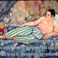 We see a woman lounging on a messy bed, a cigarette in her mouth and some discarded reading material at her feet.  She’s got on her “People you see at Walmart” striped pajama pants with a hint of camel toe, and her peach cami and no bra.  This gal cares about comfort over traditional beauty standards, and we love that!  Some art historians identify the sitter as Valdon herself, but others as just another female model.  She does bear a passing resemblance to Valdon in self portraits.