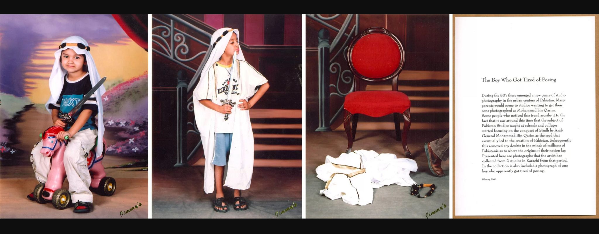 No amount of therapy has been able to figure out why parents perform such inhumane practices on their obliging and unsuspecting spawn, and since I’m no psych major, let’s just stick to the art historical aspects of this work. The work is a set of three photographs and one piece of fictional text, which I’ll come back to. The first two photographs clearly show us a young boy sporting a keffiyeh over his usual clothes, in different poses i.e. astride a plastic horse and wielding a toy sword. In the third frame, he seems to have abandoned the act altogether, leaving behind his headscarf in a heap, thus alluding to the title of the work. This getup was favorite in those days, because it was symbolic of bin Qasim, the young Umayyad general who captured the Pakistani province of Sindh in 711 and bought Islamic philosophy and practice to the region. In fact, there was quite a bit of pop culture centered on bin Qasim in the '80’s, including a popular TV show based on the general’s life.
