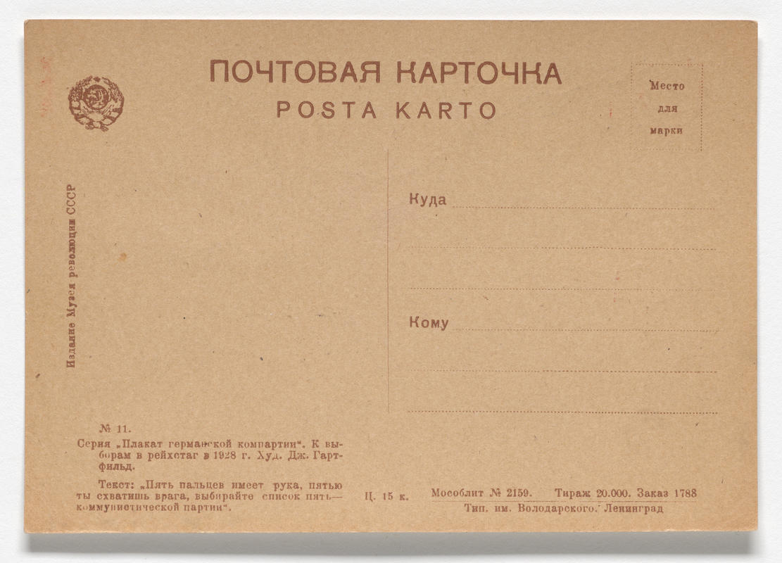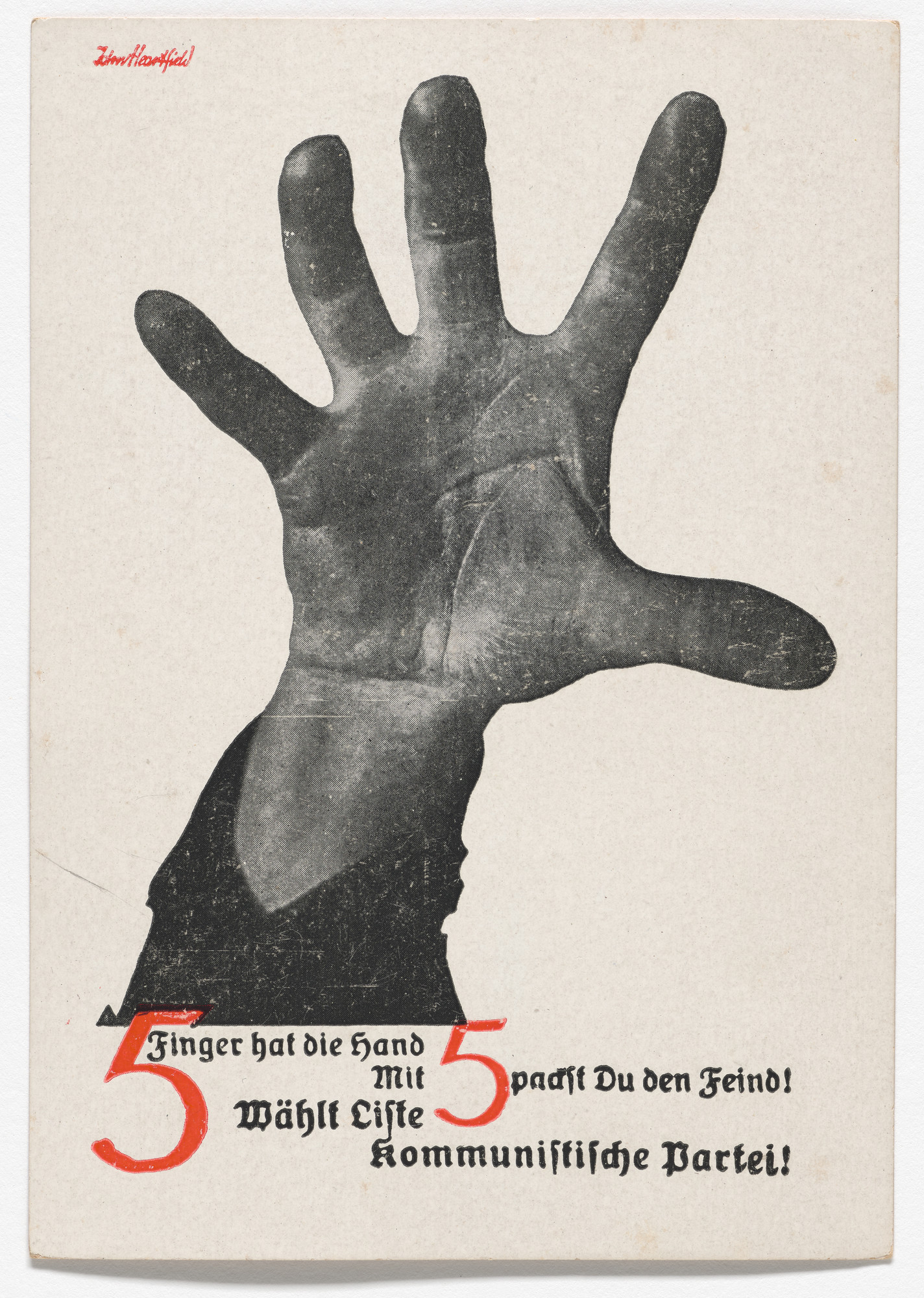 John Heartfield created The Hand Has Five Fingers for the KPD – the German Communist Party – during the 1928 Reichstag electoral campaign. German cities were covered in posters encouraging people to vote for the party. When translated into English the German writing on the image says: “5 fingers has the hand. With 5 you seize the enemy. Vote list 5 Communist Party.” The indicated boiler suit and the hand stained with soot immediately evoke images of a worker making a living by doing manual labor.