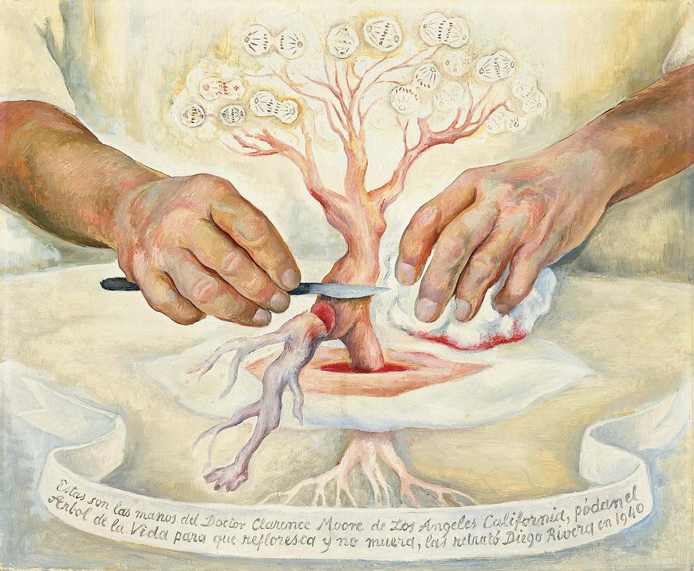 The majority of the elements used in creating this piece are trademark elements found in works by Frida Kahlo, Diego Rivera’s former wife. The reference to roots, the use of the female body, the presence of blood, and even the banner across the bottom of the work are all Frida’s trademarks. At the time of painting this work, though, Frida had been dead for a year.