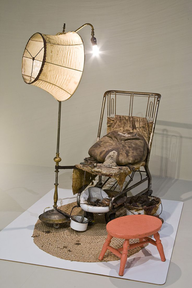 The buckets, bedpan, dirty instruments, and blood-soaked rags say it all. A shopping cart cut in half becomes the operating table; a cement bag resembling a sagging body spills its innards. Kienholz the social critic spared nothing. Didactic yes, subtle not so much. Conventional “prettiness” was not his thing.