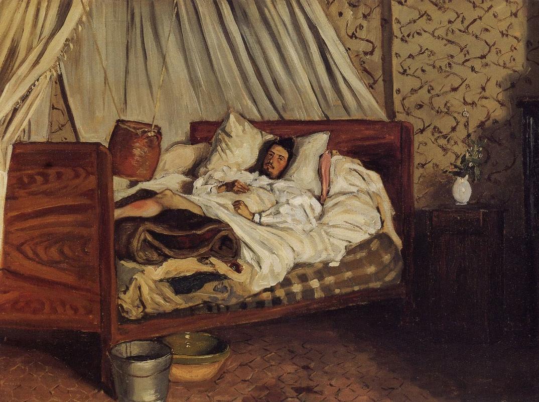 Monet was poor at the time and really needed a model. He begged for Frederic Bazille to come down and pose for him, pestering him for months. But by the time Bazille finally arrived, Monet was bedridden.