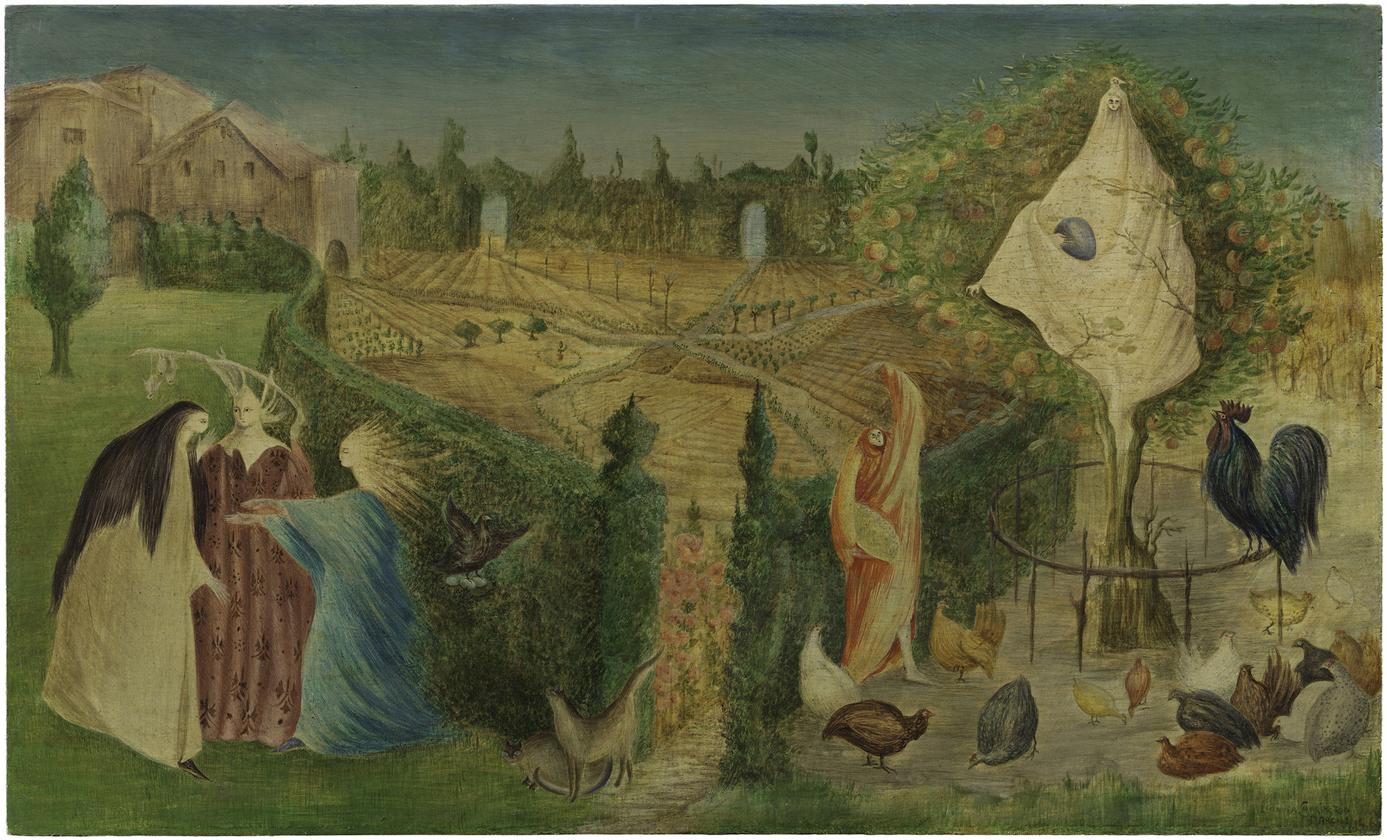 By 1946, when she composed this painting, she was pregnant with her first son, Gabriel "Gaby" Weisz-Carrington, by the Hungarian Jewish photographer Emérico "Chiki" Weisz Schwarz. Both expatriates, Carrington and her husband remained married for sixty-one years. Carrington met Schwarz while she was living with Remedios Varo, with whom she often discussed the subjects of mysticism and alchemy. Carrington and Varo also studied the oral traditions of the Kʼicheʼ people, collected in a text called the Popol Vuh. In many ways, the K'iche' are the first surrealists, and the Popol Vuh gives us fantastic lines like this one: "Hushed and empty is the womb of the sky." The titular kitchen garden shown here, where food and nourishment are grown, can be seen as a metaphor for creation. The chickens and the symbol of the egg present throughout the work further suggest a theme of motherhood and fertility.