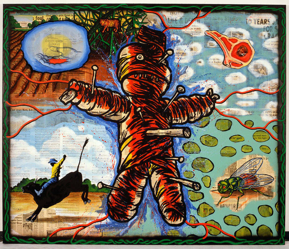 In typical Wojnarowicz fashion, this painting is dark, twisted and mesmerizing nonetheless...just like the artist himself. Wojnarowicz is taking us on a stroll through the American history books. Apparently, Wojnarowicz feels the testosterone drenched sport of bull riding, a handful of blood, some meat, and a fly with a human face represent American history. I should probably clarify that Wojnarowicz barely made it out of high school so perhaps we should not rely on him for the most accurate portrayal of historical events. What we can count on him for is his ability to deliver a stiff slap across the face to anyone who tries to shut him up, leaving us to wonder, who is the poor victim at the other end of that voodoo doll?