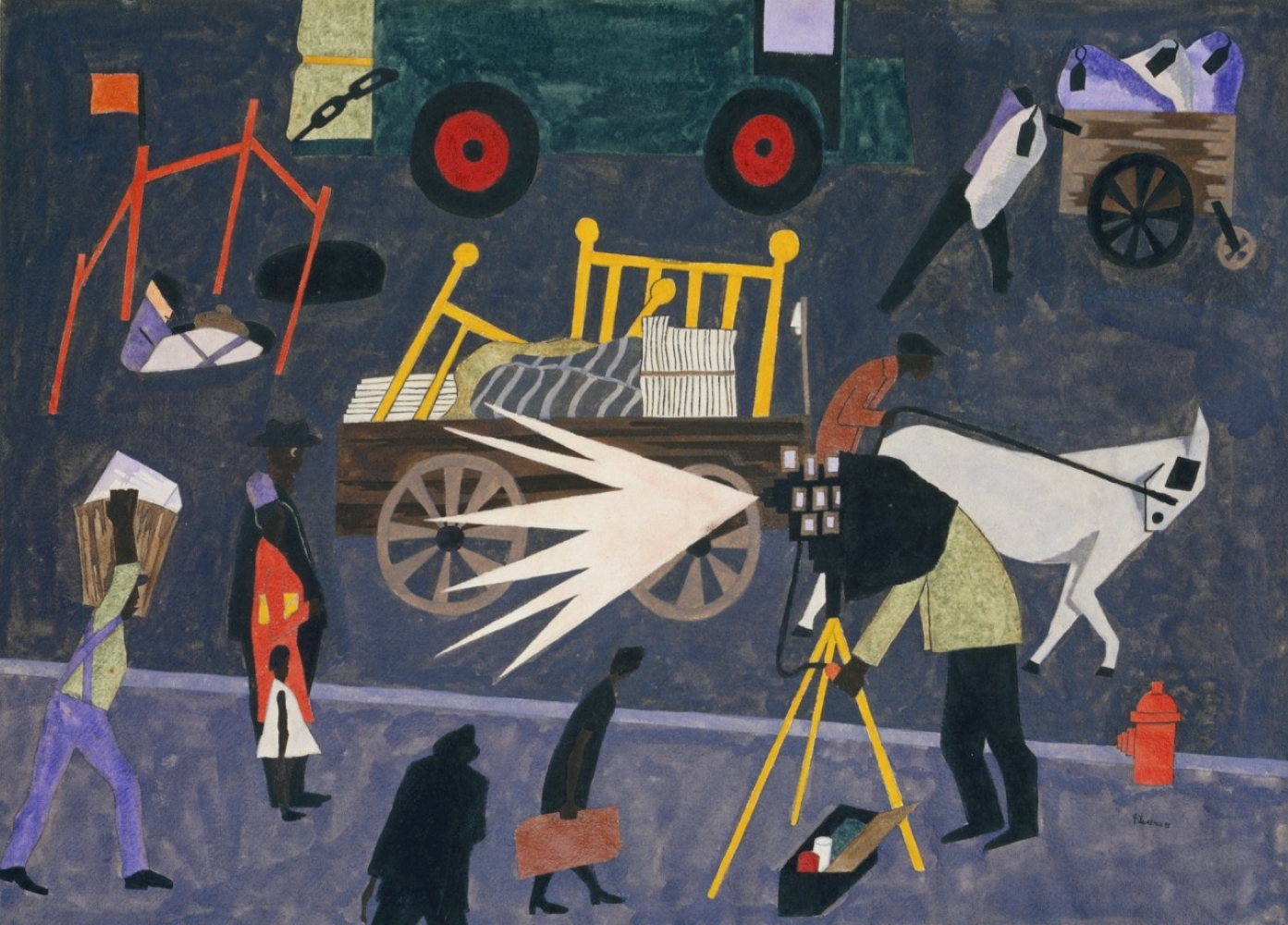 Comparisons aside, The Photographer documents a moment in time, a moment that would soon be a rarity; by then, photography was already very accessible to people without any experience in the medium. However, Lawrence doesn’t just capture a moment in a working man’s day. He also visualizes the transition from the old to the new, from the horse-drawn wagon alongside a contemporary truck, to the man carrying a basket with ice on his shoulder sharing the sidewalk with an office worker toting a briefcase. He would continue to show other contrasts in the daily lives of (mostly) Black people throughout his career.