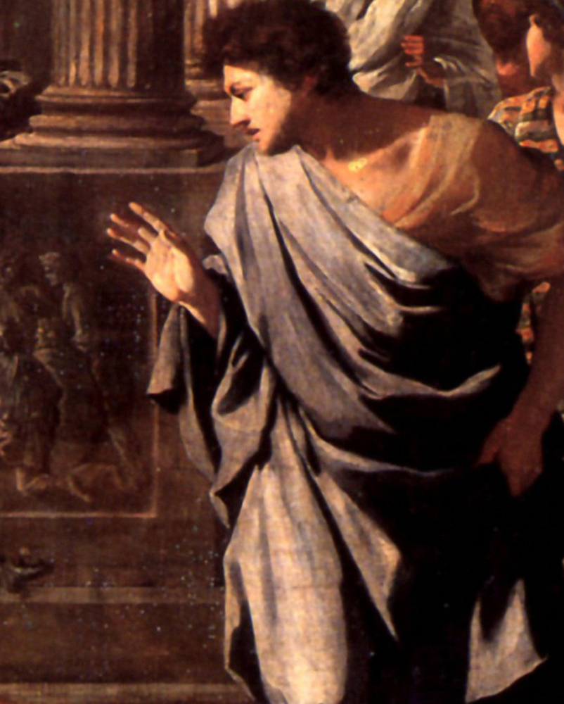 In addition to being a crook, Fabrizio was also a bit odd. He commissioned an exact copy of this painting from Angelo Caroselli before Poussin had even finished the original. Poussin's original hangs in the Louvre, and Caroselli 's copy in the National Gallery in London. For a while it was not clear which of these world class museums had the original and which had the copy!