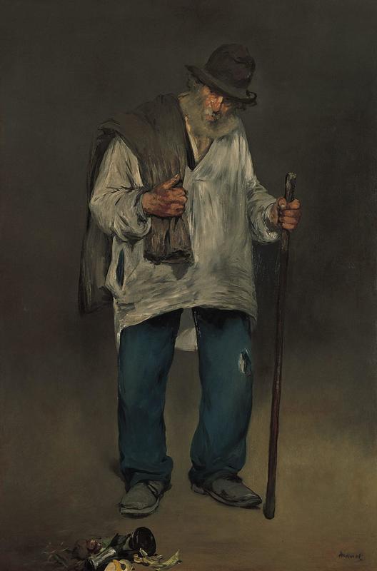 I believe "The Ragpicker" by Edouard Manet is one of those pieces that carry enough weight to make a statement on its own. It depicts a man who is visibly poor, wearing dirty, ragged clothes and standing next to a pile of trash. This is very different from Manet's usual paintings which depict wealthy-looking women, the bourgeoisie, and all sorts of people with some sort of ease in the way that they live. For instance, his painting Nana, depicts a woman beautifully dressed, standing in front of her mirror while doing her makeup. This is an indicator that she could afford the beauty products she was using and was also living a life that allowed her to have time for such things, so she was neither a maid nor an employee in a factory. There is also a man in the corner, looking like he was begging for her attention, which shows that the goal of that portrait was to place all the attention on Nana and her beauty. The vivid colors that were used in it are also an indicator that the painter wanted to communicate a certain sense of how alive Nana was. However, the ragpicker is displayed as the emblem of poverty as he represents the poor man of that society. It was painted in 1869, ten years after a painting he called "The Absinthe Drinker" which also depicted an alcoholic dressed pretty modestly. I would think the fact that the ragpicker also wears a hat was Manet's way of tying the two paintings by showing one of the possible outcomes of alcoholism: poverty. Also, since Manet has been reported to have been fascinated by Diego Velasquez, his two paintings may have been his way of paying tribute to him by making two characters out of his painting "Menippus" which depicts an old, shaggy man with a hat similar to the ragpicker, while wearing clothes like the absinthe drinker.