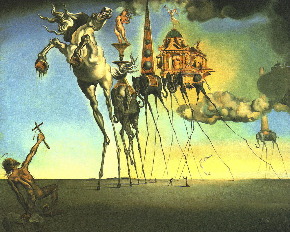 Saint Anthony was a man of simple tastes. He left Egypt to live in the desert as a hermit, devoid of worldly pleasures and joy. This simplistic bliss was never reached unfortunately, for the devil liked to pick on poor Anthony, tempting him with the pleasures he missed most from his regular life. Why he missed elephants with spindly legs is beyond us.