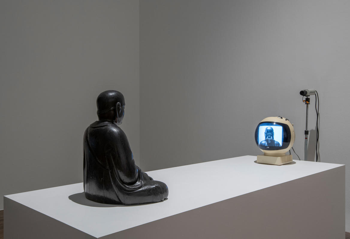 Nam June Paik also had a lot of ideas when it came the themes covered here. He revisited similar ideas in Stone Buddha/Burnt TV (1982), which includes a Buddha looking over a burnt television, TV Rodin (1982), where a mini version of Auguste Rodin's The Thinker is placed on top of a Sony Watchman, and TV Buddha (1982) which includes a Buddha studying a screen covered in dirt.