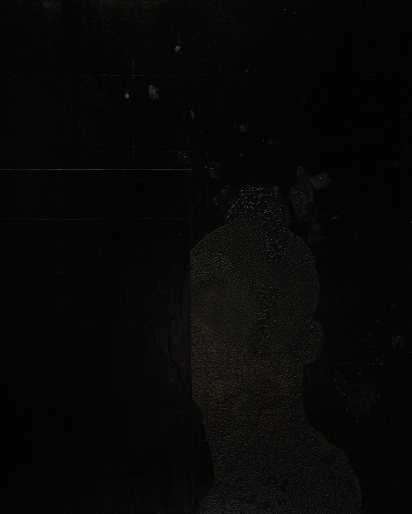 Keeping in the tradition of Gallagher's large-scale paintings, Untitled consists of black rubber which is texturized with paper on canvas. On the lower right of the painting, Gallagher used enamel and rubber to depict an African person, that she describes as a "fantasy." The viewer sees the back of the African person's head, with a mohawk hairstyle, tattoos and piercings.