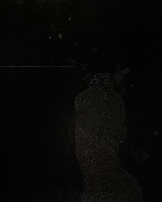 The image itself, which can be a bit difficult to see at first, becomes clearer the longer one looks at it, especially from a distance. However, one needs to look a little closer to see the details; we can see the back of a person’s head with a Mohawk hairstyle, some jewelry, and tattoos. This painting may have been a part of a series that she began in 1998: black, monochromatic paintings that also used mixed media, and were a “direct response to the critical interpretations of her previous works.” Her previous work includes collages, some of which contained imagery of 19th-century minstrel shows, such as the exaggerated wide eyes and lips commonly found in blackface.