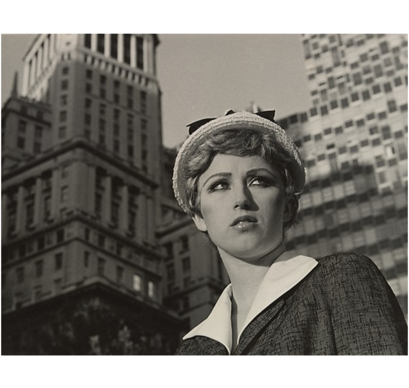 This series of 69 photos aim to suggest Hollywood films of the 1950s. This one in particular draws on Hitchcock’s “career girl” making her own on the streets of the Big Apple. Little girl, big city, even bigger dreams.