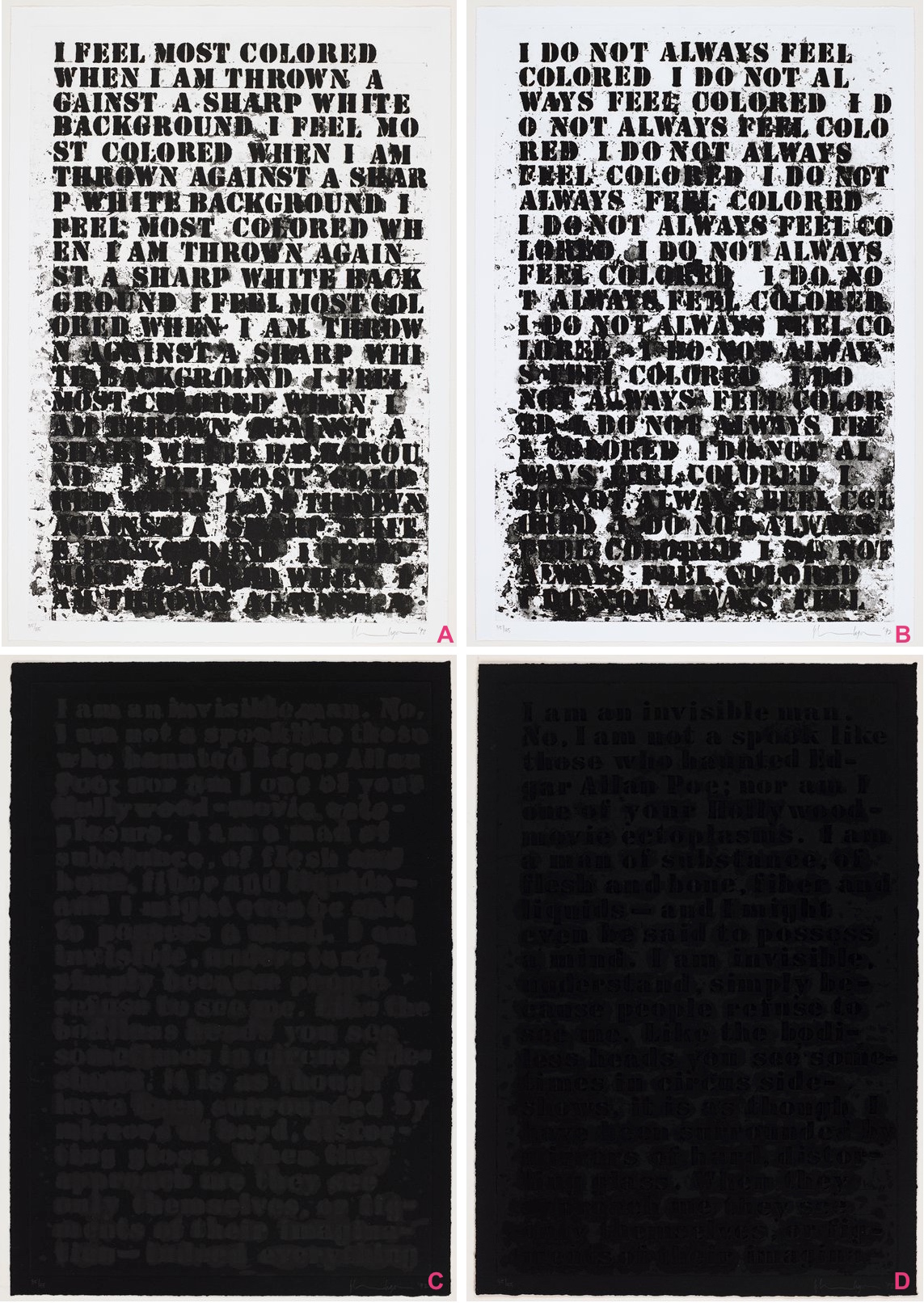 The series uses quotes (or in artspeak appropriates text) from both Zora Neale Hurston’s essay “What it Means to Be Colored Me” and Ralph Ellison’s Invisible Man with etchings [A] and [B] quoting Hurston and [C] and [D], Ellison. On a process-based note for art nerds like me, Ligon’s soft-ground etchings use the alternative printmaking processes of ‘spitbite’ and ‘sugarlift.’ What this means is that the printing matrix (usually a zinc-plate, but a copper plate can be used) is prepared with an acid-resistant coating called soft-ground. The prepared plate is then drawn on with acid from the acid bath for the “spitbite,” while for “sugarlift” the plate is painted with a solution of gum arabic, hot water, and sugar. Ligon combined these processes to intentionally highlight and obscure Hurston and Ellison’s appropriated texts.
