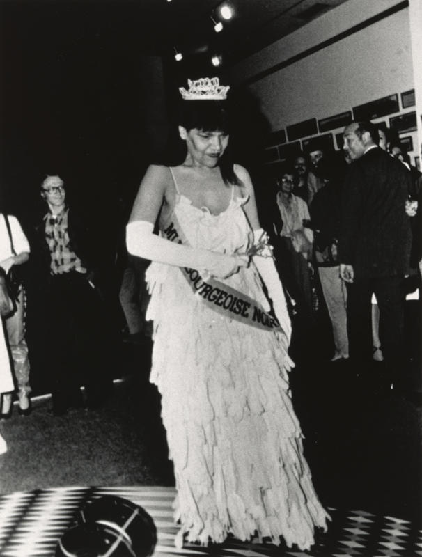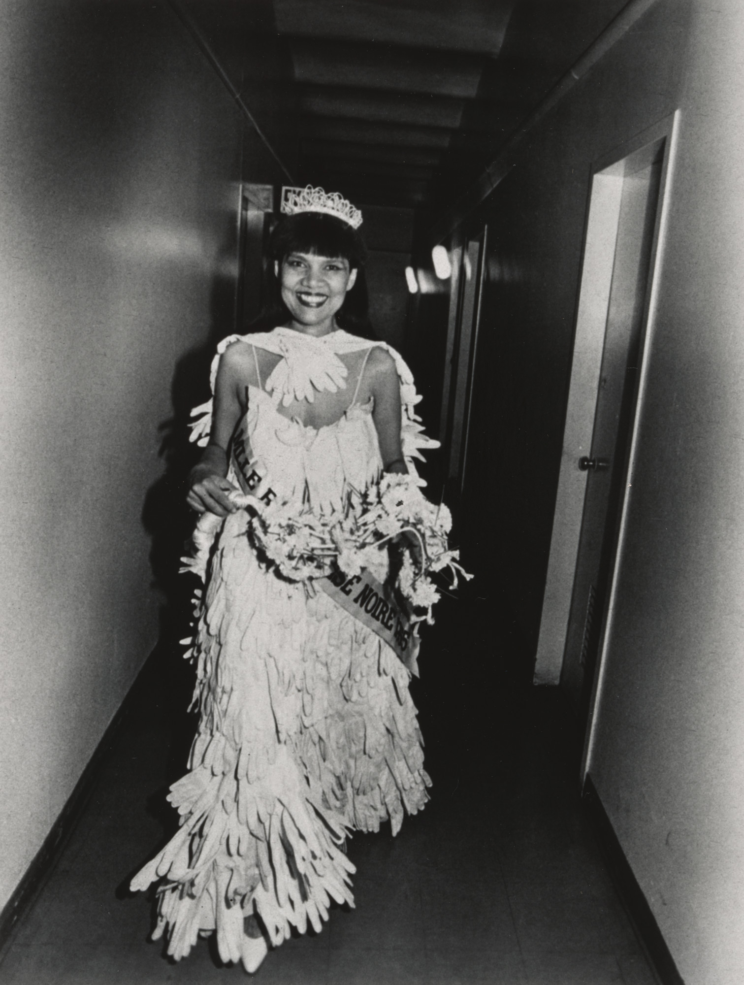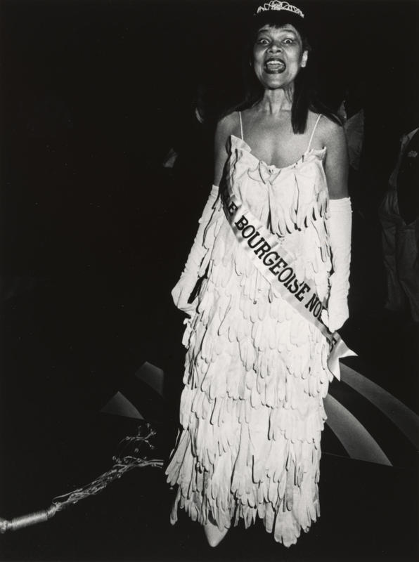 Mlle Bourgeoise Noire wears elbow-length gloves and a dress constructed from 180 pairs of gloves found in Manhattan thrift shops. Her tiara and sash, which proclaims “Mlle Bourgeoise Noire 1955," serves as certification of her achievements. She carried a cat-o-nine tails whip, a torture device which was used on slaves on Southern plantations, decorated with white chrysanthemum blossoms. The white gloves act as a metaphor for the repressed psychology of the Black middle class, and the whip represents the history of violence which conditioned it.